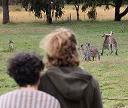 Exclusive Wildlife Stay participants watching the nearby Eastern Grey Kangaroos at Grampians Paradise Camping and Caravan Parkland