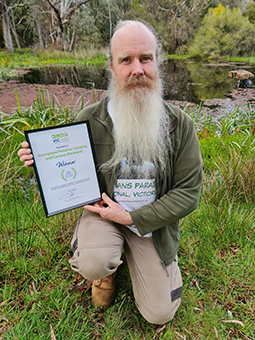 Aidan Banfield of Grampians Paradise Camping and Caravan Parkland out beside one of the ponds of Redman Bluff Wetlands (which he build beside the camping ground), holding the winers certificate for the Green Parks Award from the Victorian Caravan Parks Association.